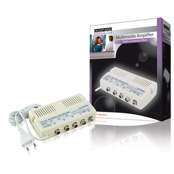 König retourkanaal multimediaversterker met 3 TV-uitgangen en ingebouwde splitter voor internetkabelmodems. Kan gebruikt worden wanneer internet wordt geleverd door het kabelbedrijf.